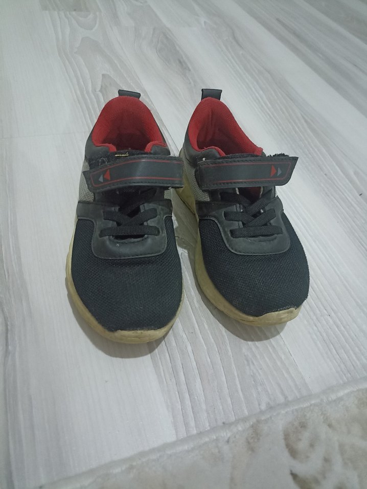 Gri renkli, Velcro bantlı, kauçuk tabanlı erkek çocuk spor ayakkabısı. Rahat ve günlük kullanım için uygun.