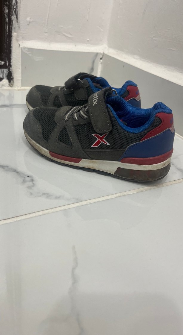 Gri renkli, baskılı detaylara sahip erkek çocuk spor ayakkabısı. Velcro bantlı ve kauçuk tabanlı, rahat ve kolay giyilir.