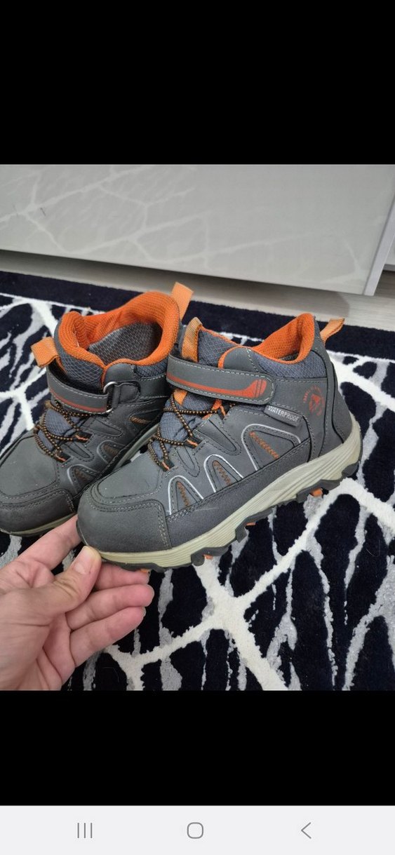 Gri renkli, baskılı desenli, kauçuk malzemeden yapılmış erkek çocuk street wear botlarıdır. Kolay kapanan cırt cırtlı bantları ve turuncu dolgulu iç kısmı vardır. Suya dayanıklı ve sağlamdır aynısının büyüğünü aldım sadece 1 kış giydik.