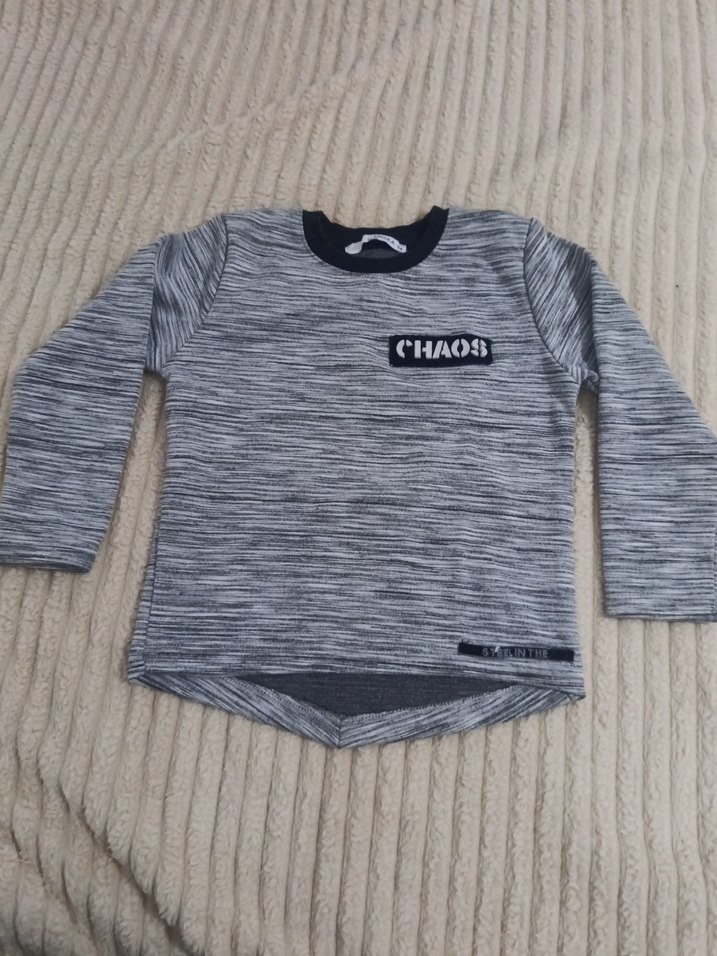 Bol kesim, uzun kollu, yuvarlak yaka gri erkek çocuk sweatshirtü, örgü yün kumaştan. 'CHAOS' baskılı, sokak stiline uygun desenli. 4 yaş yumuşak kumaş sıfır ayarında