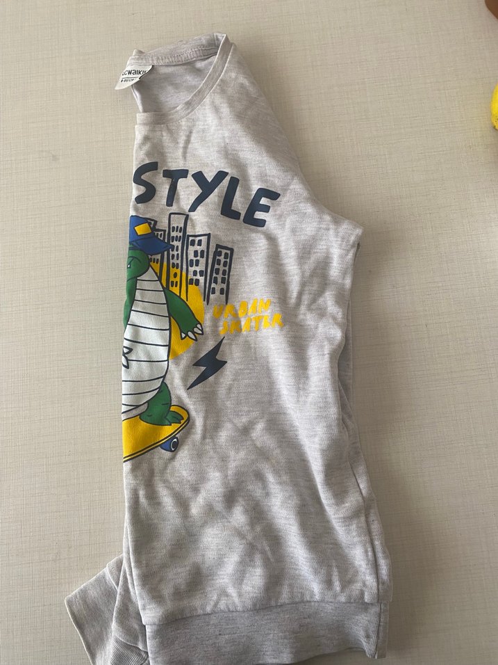 Gri renkli, uzun kollu, bisiklet yaka ve bol kesim erkek çocuk sweatshirtü. Sentetik kumaştan, baskılı ve fermuarlı detaylı, "STYLE" yazılı tasarımla.