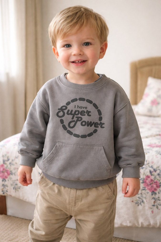 Gri renk, bisiklet yaka ve uzun kollu erkek çocuk sweatshirtü, bol kesim ve "I have Super Power" baskılı. Yumuşak kumaştan, düğmeli ve ön cep detaylı.