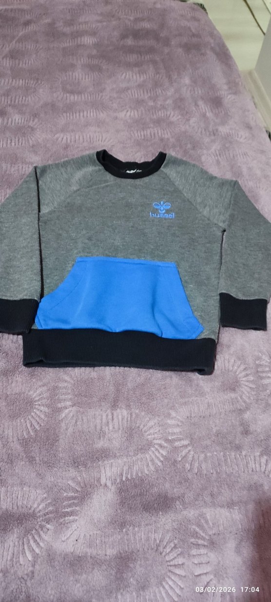 Gri renk, uzun kollu, yuvarlak yaka, bol kesim çocuk sweatshirtü. Yumuşak kumaştan, mavi cepli ve baskılı desenli, rahat sokak stili için uygundur.