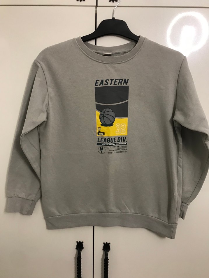 Gri renkli, uzun kollu ve yuvarlak yakalı erkek çocuk sweatshirtü. 'EASTERN LEAGUE DIV.' baskılı, rahat kesimli ve yumuşak fleece kumaştan üretilmiştir.