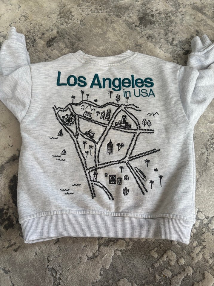 Gri renk, uzun kollu, yuvarlak yakalı erkek çocuk sweatshirtü. Yumuşak ve sıcak kumaştan, 'Living in LA' baskılı rahat bir sokak stili. Yeniden farksız