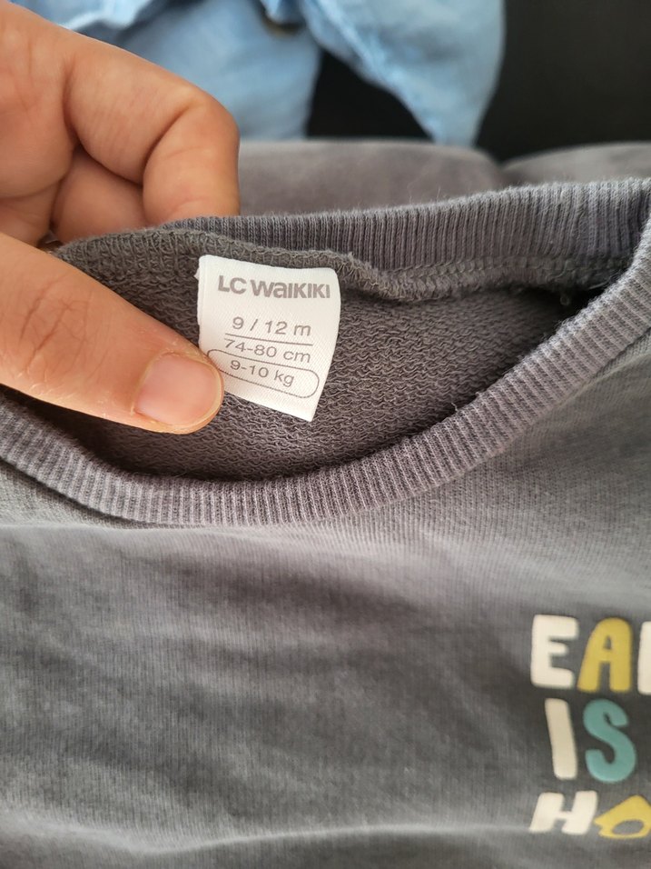 Gri renkli, bisiklet yaka ve uzun kollu erkek çocuk sweatshirtü. Rahat kesim, yumuşak ve sıcak kumaş, baskılı desen ve cırt cırtlı detay içerir. 9-12 ay beden.