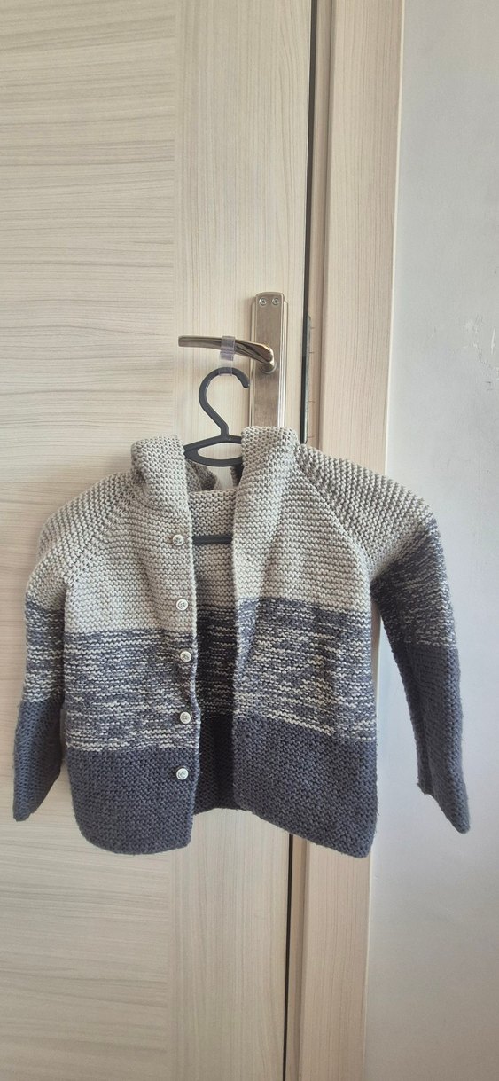 Gri renkte, uzun kollu ve bol kesim olan örme erkek çocuk hırkası. Desensiz, normcore tarzda, rahat kullanıma uygundur. el örgüsüdür.