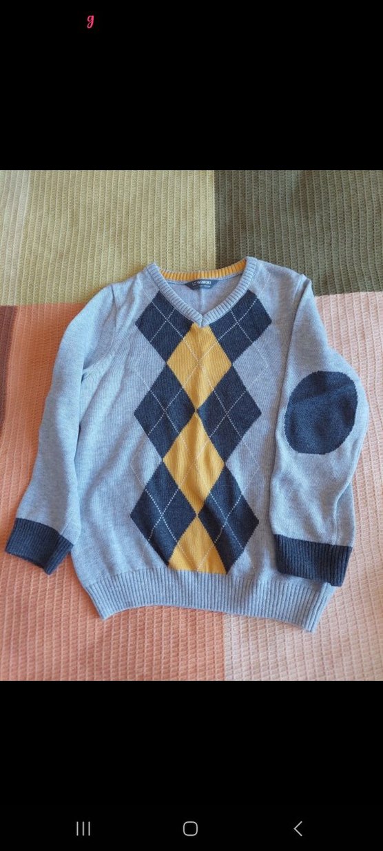 Gri renkli, uzun kollu erkek çocuk triko kazak. Gevşek kesim, bisiklet yaka ve sarı ile koyu mavi elbise detaylarına sahip. Rahat ve şık bir tercih.