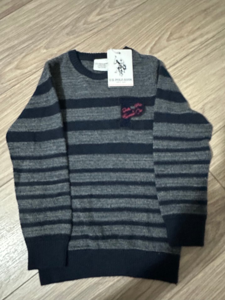 Uzun kollu, bisiklet yaka ve gri tonlarında çizgili desenli erkek çocuk kazağı. Rahat kesimli ve yumuşak, sıcak tutan kumaştan üretilmiş