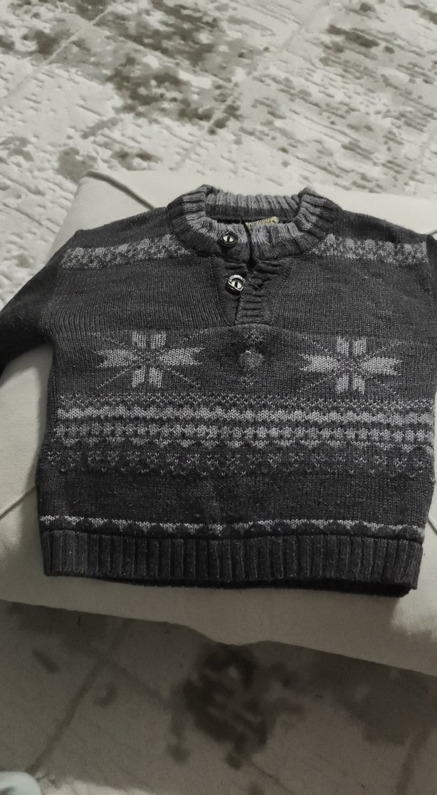 Gri renkli, triko örme erkek çocuk kazak, yuvarlak yaka ve uzun kollu, rahat ve bol kesimlidir, hafif desen detayları bulunur.