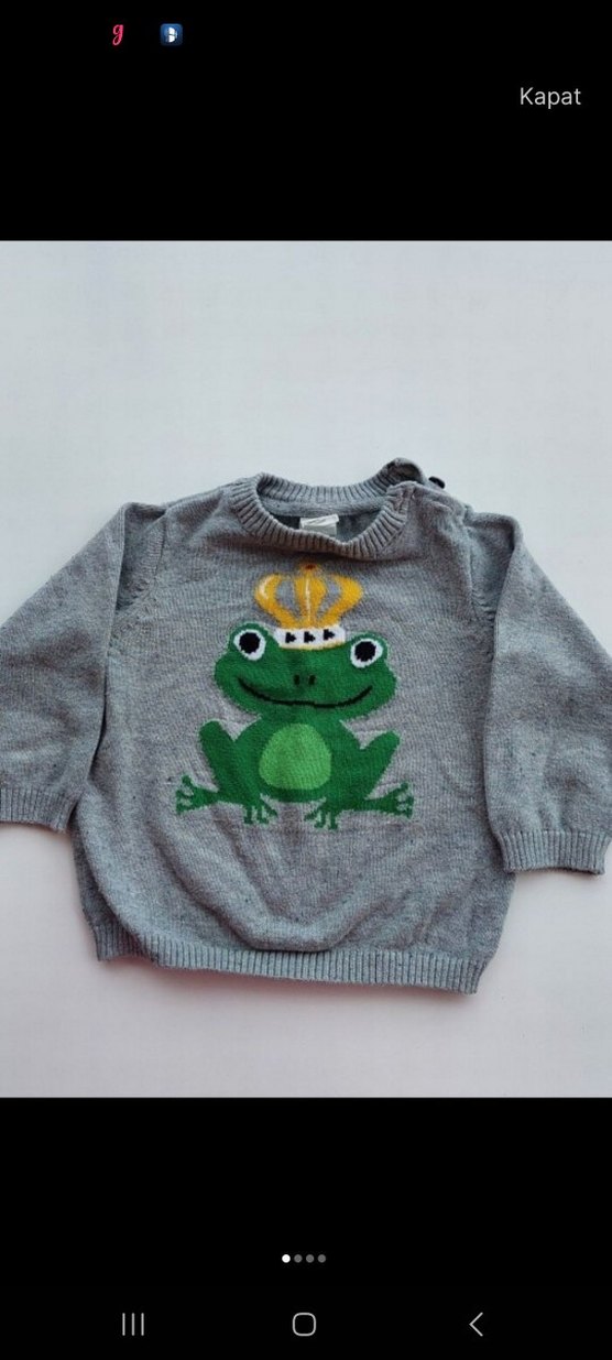 Gri renkli, triko kumaştan yapılmış erkek çocuk kazak. Uzun kollu, yuvarlak yaka ve kurbağa baskılıdır. Rahat kesimiyle günlük kullanım için uygundur.