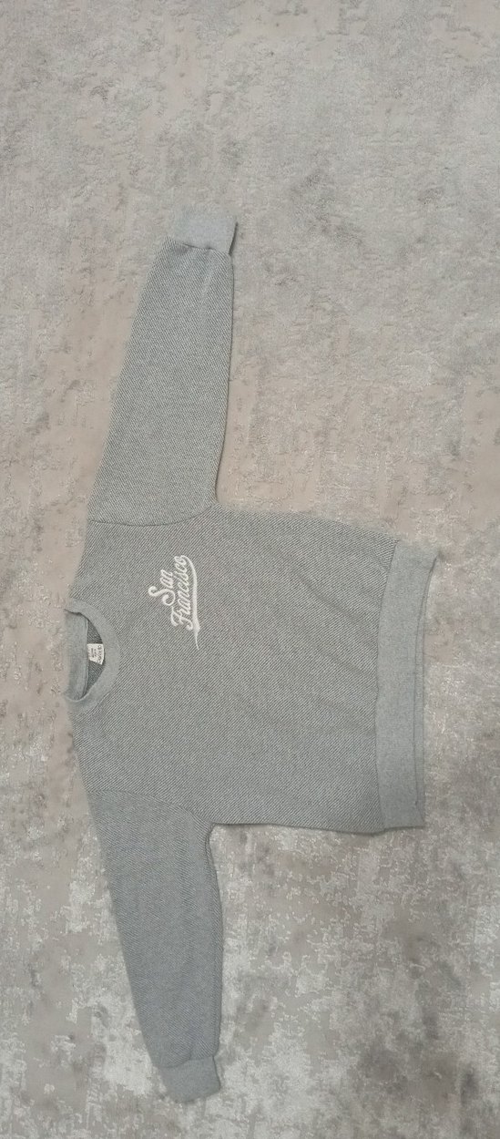 Gri renkli erkek çocuk triko sweatshirt, uzun kollu ve yuvarlak yakalıdır. Örgü dokusu ve bol kesimiyle günlük rahat kullanıma uygundur.