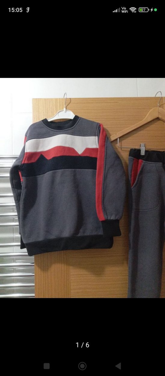 Gri triko sweatshirt, bisiklet yaka ve kırmızı, beyaz, siyah renk bloklu baskılı, eşofman altı ile takım. Regular fit ve yumuşak fleece kumaş, rahat sokak stili için uygundur.