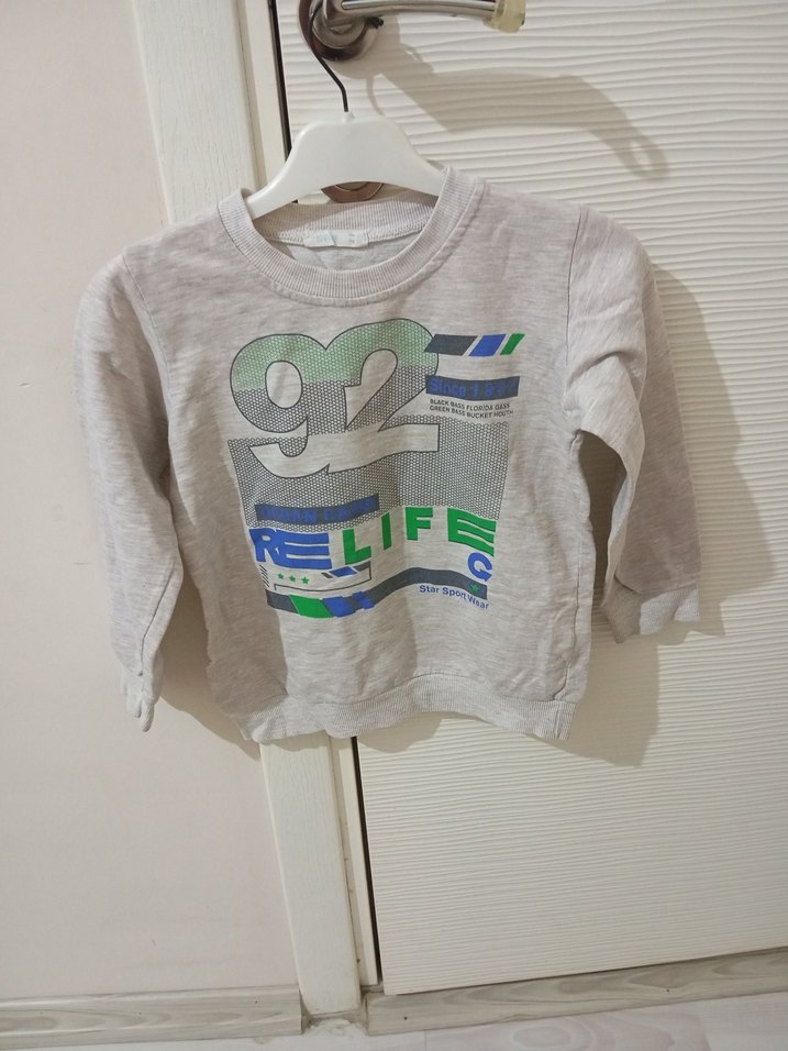 Gri renkli, uzun kollu ve yuvarlak yakalı erkek çocuk sweatshirtü, rahat kesimi ve baskılı tasarımıyla dikkat çeker. Örme yumuşak kumaştan üretilmiştir.