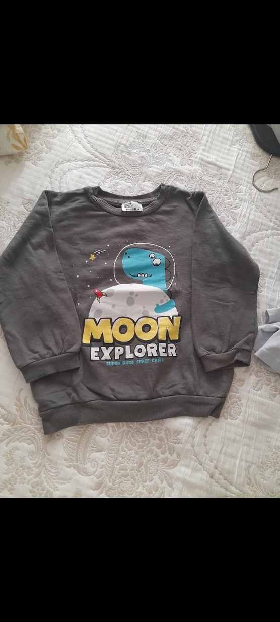 Gri renkli, uzun kollu, triko dokulu erkek çocuk sweatshirtü. Önde 'MOON EXPLORER' yazılı uzay temalı baskı bulunur. Rahat ve bol kesimdir.