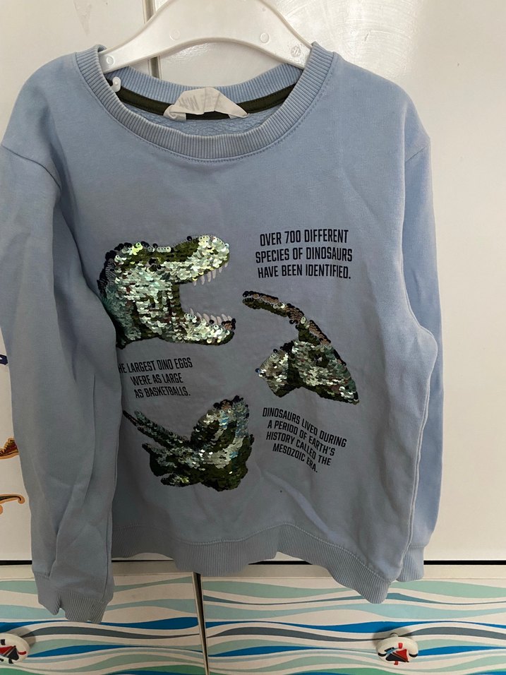 Gri renkli, uzun kollu, yuvarlak yakalı erkek çocuk sweatshirtü. Üzerinde payetli dinozor baskısı ve rahat kesimi bulunur. Minik leke var