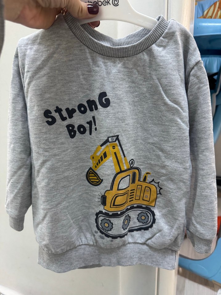 Gri renkli, uzun kollu ve bisiklet yaka erkek çocuk sweatshirtü, üzerine basılı iş makinesi ve 'Strong Boy!' yazısı bulunur. Örgü kumaştan yapılmıştır.