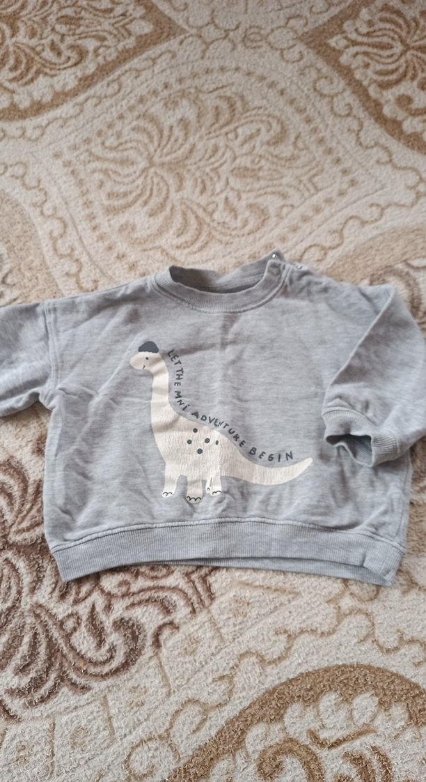 Gri renkte, bol kesim, uzun kollu, bisiklet yaka erkek çocuk sweatshirtü. Önünde örgü görünümlü baskılı dinozor deseni bulunur.