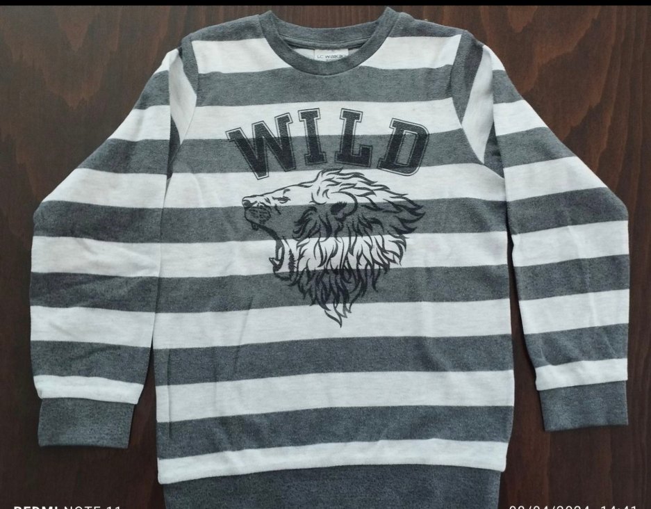 Gri-beyaz çizgili, uzun kollu ve yuvarlak yakalı kazak Önünde aslan baskısı ve 'WILD' yazısı bulunur. Rahat kesim ve yumuşak, sıcak dokuma kumaştan üretilmiştir. giyilebilir durumda bize küçük geldiği için satışta
