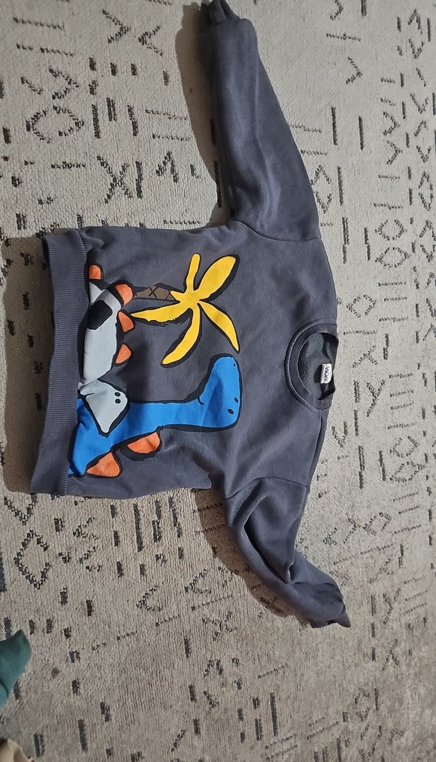Gri renkli, bol kesim erkek çocuk sweatshirtü. Uzun kollu, yuvarlak yaka ve renkli baskılı tasarıma sahip.