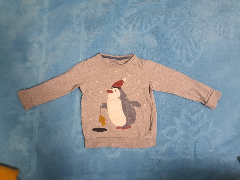 Gri renkli, uzun kollu ve bisiklet yakalı erkek çocuk kazağıdır. Yumuşak dokulu triko kumaştan üretilmiş, bol kesim ve kırmızı şapkalı penguen baskısı vardır. Örgü dokusu konfor sağlar. ❄️