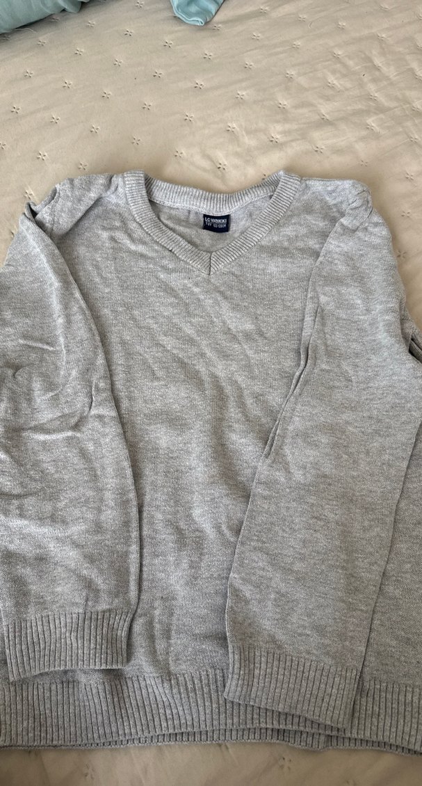 Gri renkli, keten kumaştan yapılmış, V yaka ve uzun kollu erkek çocuk kazak. Rahat kesimi ve sade tasarımıyla günlük kullanıma uygundur.