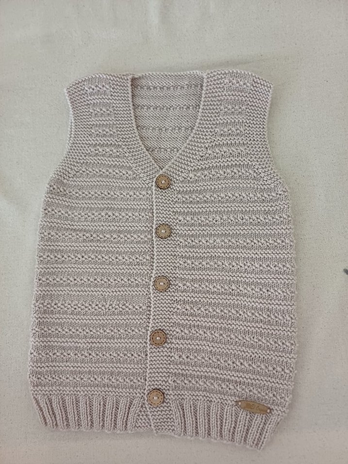 Düğmeli, V yakalı, gri renk erkek çocuk örgü süveter. Kolsuz ve rahat kesim, sade bohem tarzda.