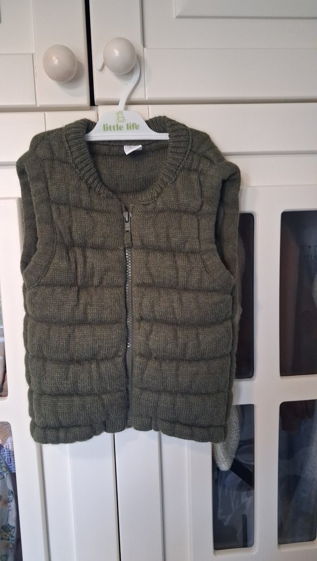 Gri renkte, örgü yün kumaştan yapılmış, kolsuz ve boğazlı erkek çocuk yeleği. Fit kesim ve desen yok, günlük şık tarz için uygun.