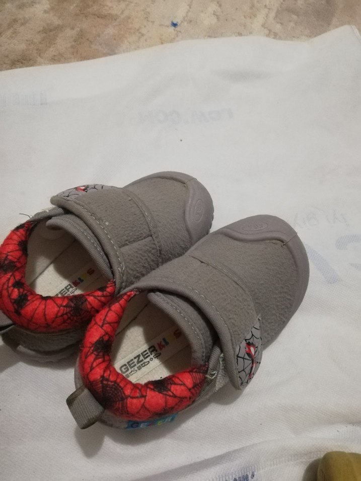 Gri renkli, yılan desenli ve kırmızı detaylı erkek çocuk terlikleri. Yumuşak sıcak kumaş ve kolay kullanım için cırt cırtlı bant içerir.