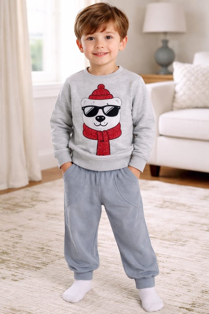 3-4 yaş gri renkte, uzun kollu ve yuvarlak yakalı üst ile rahat kesim eşofmandan oluşan erkek çocuk eşofman takımı. Sokak stili için uygundur tekli alım da yapabilirsiniz (makul tekliflere ve ürün birleştirmeye açığım)