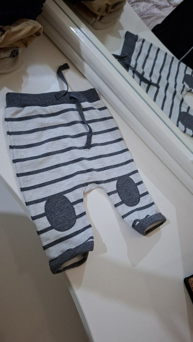 Yumuşak fleece kumaştan, gri renkli, zebra desenli, düğmeli, bol kesim erkek çocuk pantolonu. Streetwear tarzı için uygundur.