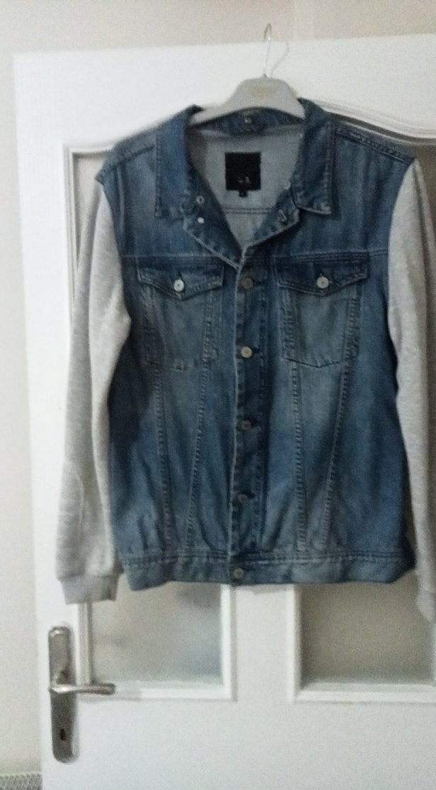 Uzun kollu, düğmeli, gri kolları olan erkek denim ceket. Salaş kesim ve hiçbir sorunu yoktur yeni gibi