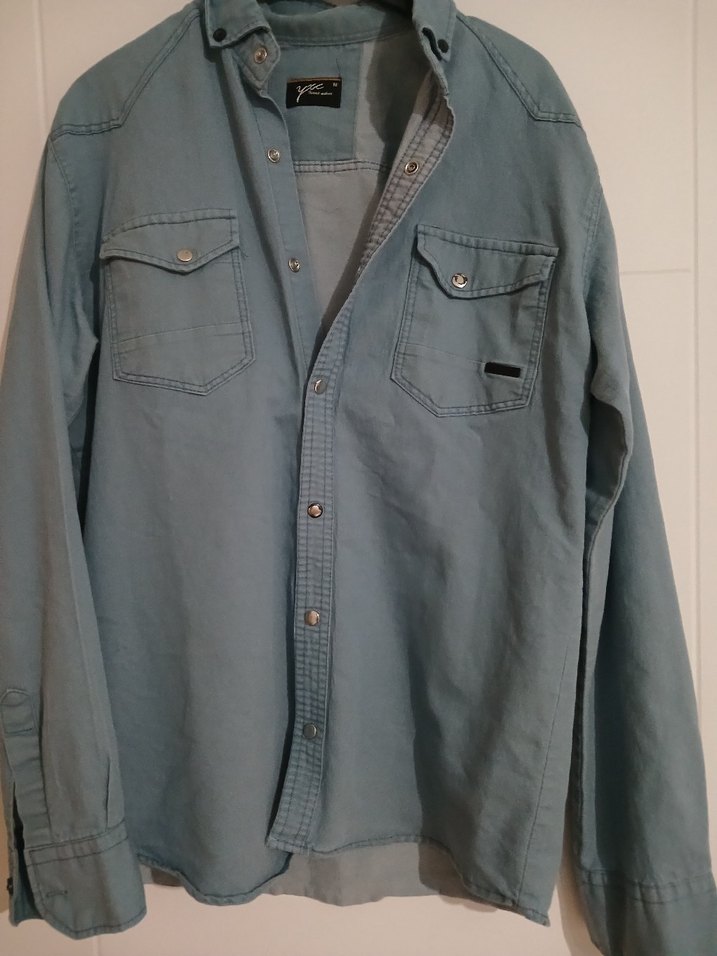 Gri renk uzun kollu denim gömlek, çıtçıtlı ön, çift göğüs cebi ve salaş kesime sahip. Günlük rahat sokak stili için uygundur.