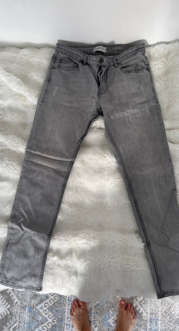 Gri renk, slim fit erkek denim kot pantolon. desensiz ve rahat günlük kullanım için uygun. Zahmetsiz şıklık sunar. Temiz bana olmadigi icin satiyorum 30-31 beden rahat giyer