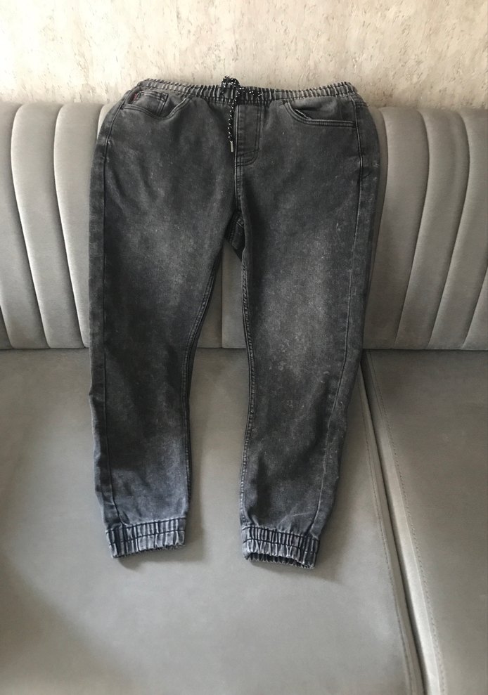 Gri renkte, loose fit kesim, kemer tokalı erkek denim pantolon. Streetwear tarzında, normal boyda ve günlük kullanıma uygun.Boyu 96 cm