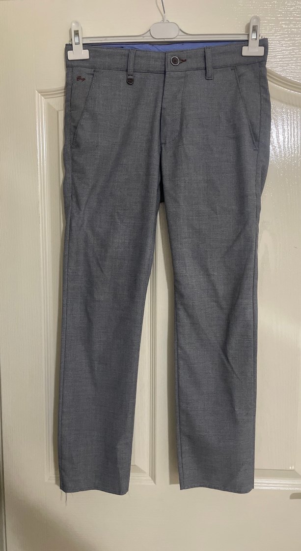 Gri denim kumaştan, düğmeli ve normal boyda, erkekler için ofis stiline uygun rahat kesim pantolon.