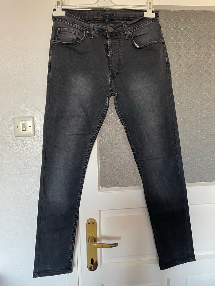 Gri renkli, regular fit kesime sahip erkek denim pantolon, tokalı detaylarla günlük kullanım için uygundur.
