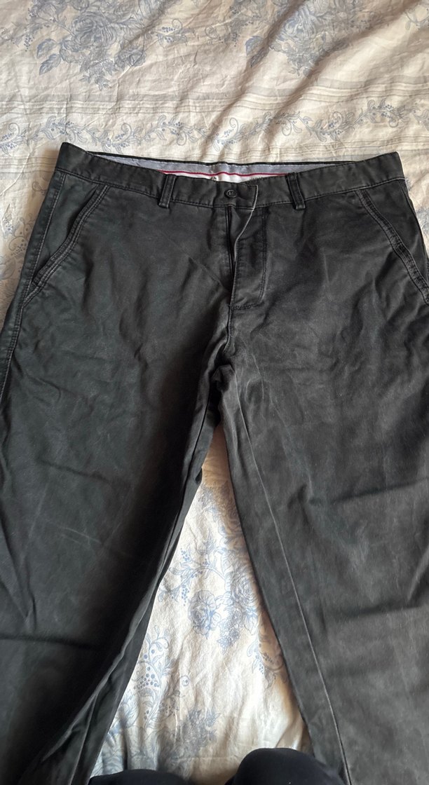 Gri renkte, düğmeli ve regular fit kesime sahip erkek denim pantolon, günlük kullanıma uygun streetwear tarzında.