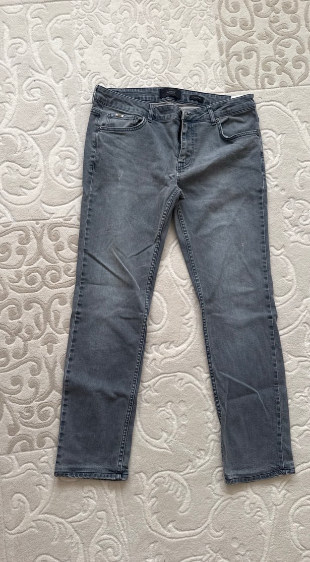 Gri renkli, düzenli kesime sahip erkek denim pantolon. Düğmeli ve desensiz yapısıyla günlük kullanıma uygundur.