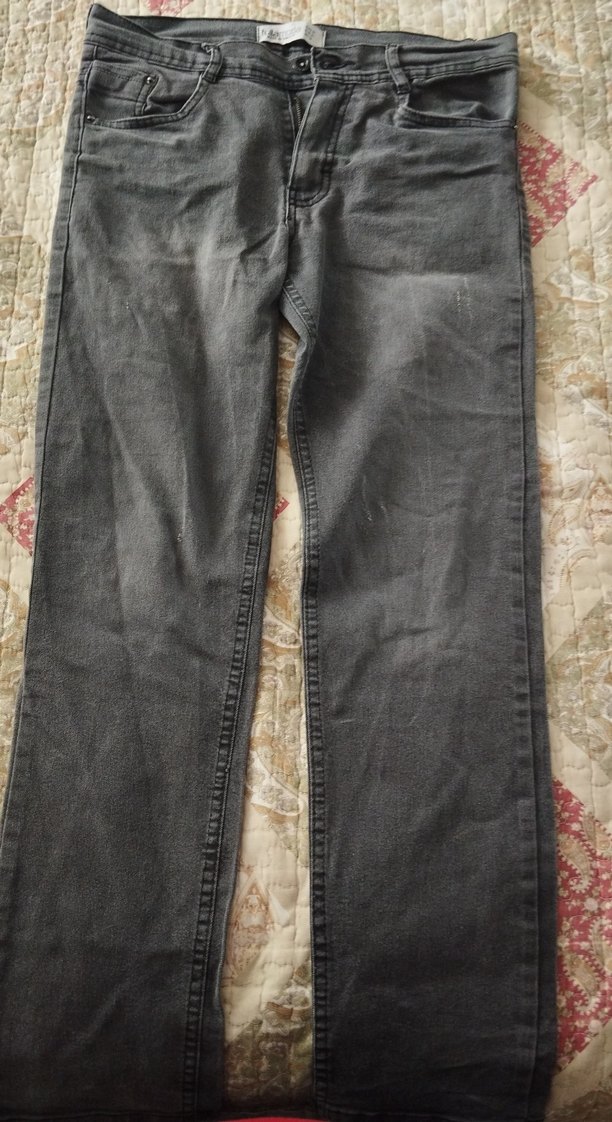Gri renkli, regular fit ve normal boy erkek denim pantolon. Düz desensiz, kemerli sokak stili, günlük kullanım için uygundur.