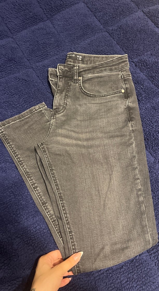 Gri renkli erkek denim pantolon, regular fit ve normal boyda. Desensiz kumaşı, günlük kullanım için rahat ve şık bir görünüm sunar. Sadece 1 kez giyildi