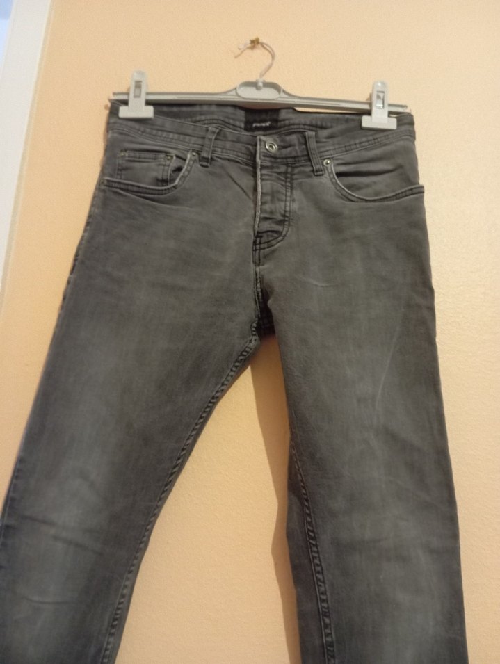 Gri renkli erkek denim pantolon, regular fit ve düğmeli kapama özelliğine sahip. Günlük kullanıma uygun, rahat bir sokak stili pantolon.
