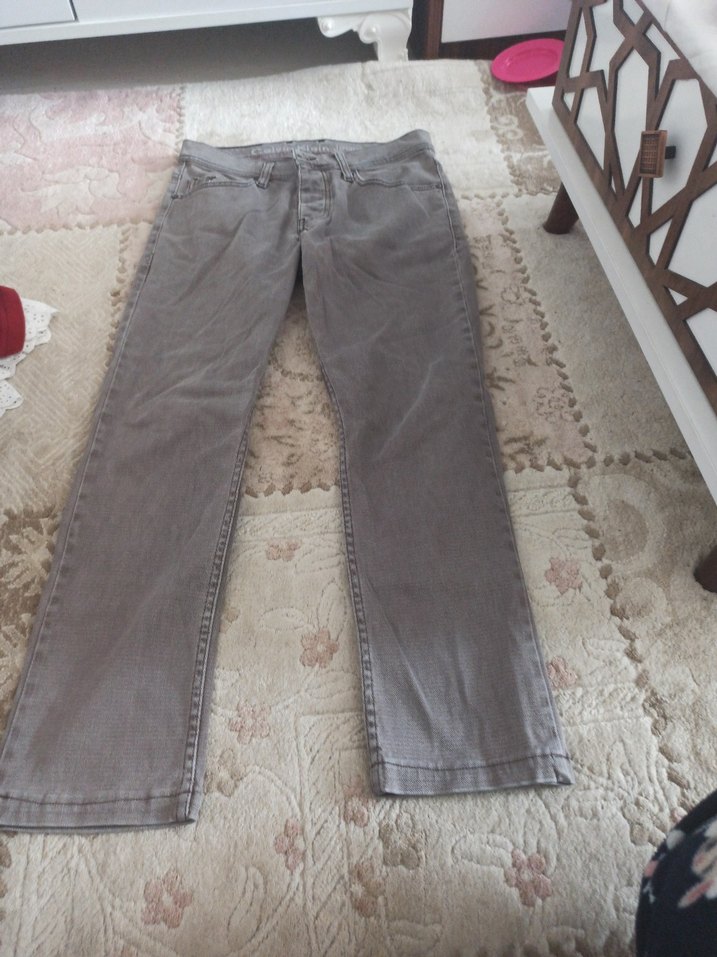 Gri renkli, regular fit kesim erkek denim pantolon. Düğmeli kapanışa sahip, desensiz ve günlük kullanıma uygun normcore tarzda bir pantolon.