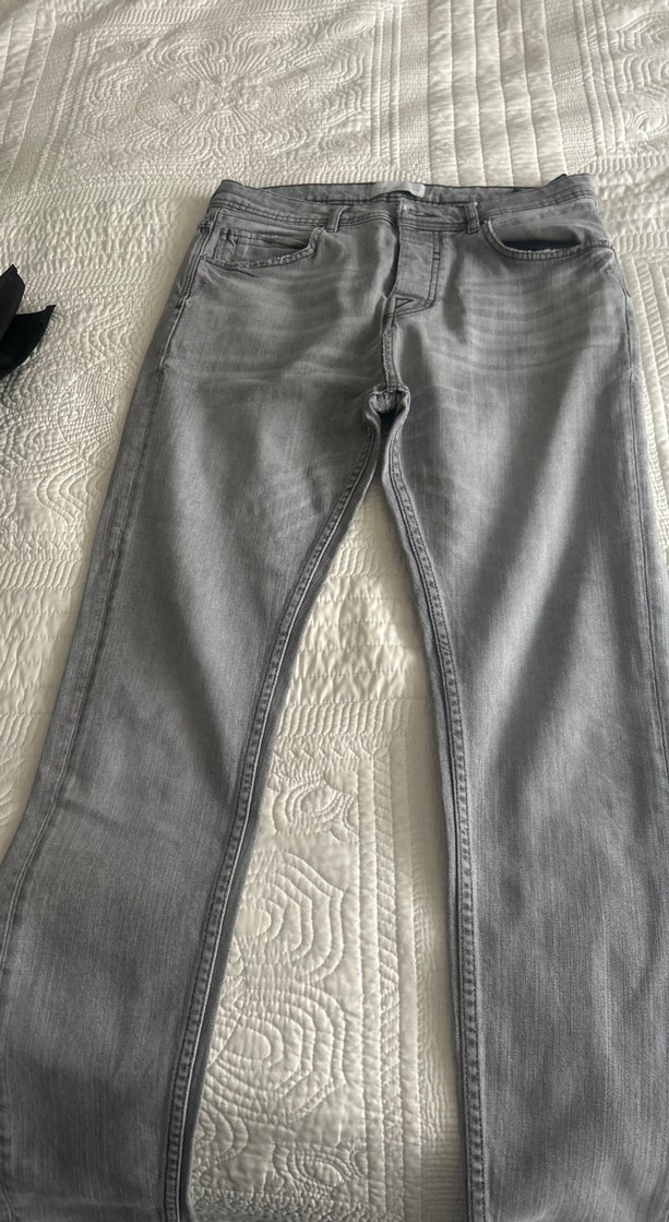 Gri renk erkek denim pantolon, regular fit kesim ve düğmeli kapanışa sahiptir. Midi boyu ve sade deseniyle günlük kullanıma uygundur.