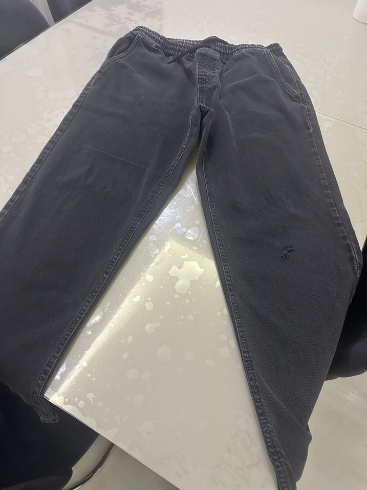 Gri renkli erkek denim pantolon, rahat kesim ve düğmeli kapanışa sahiptir. Günlük kullanım için uygun midi boy ve sade desensiz tasarım sunar.