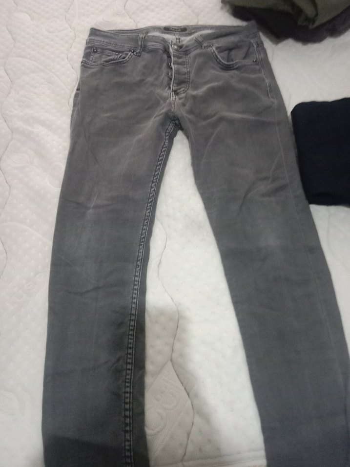 Gri renkte, düğmeli ve regular fit kesime sahip erkek denim jean. Midi boy ve desensiz, günlük kullanıma uygun sokak stili pantolon.