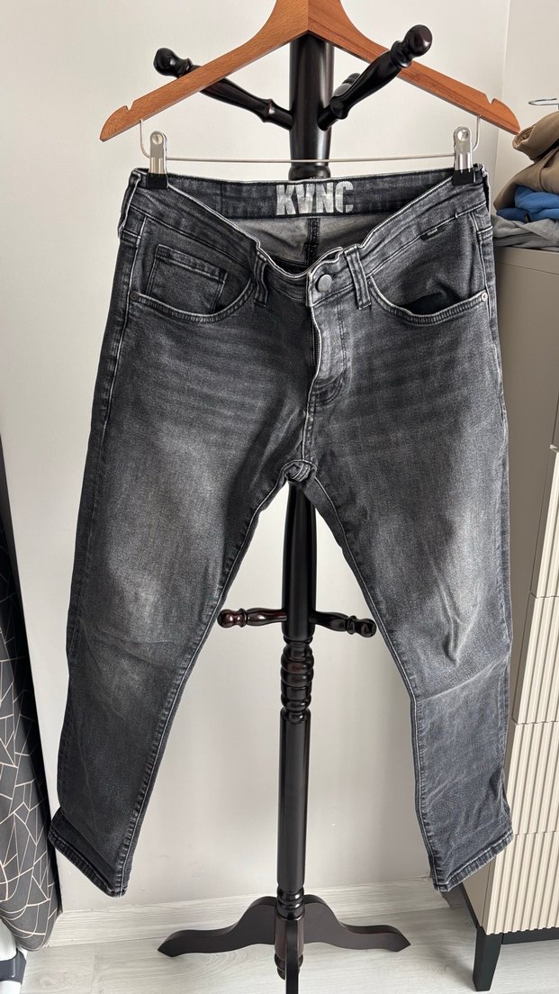 Gri denim kumaştan, slim fit kesime sahi jean. Günlük kullanım için uygun, normal boyda