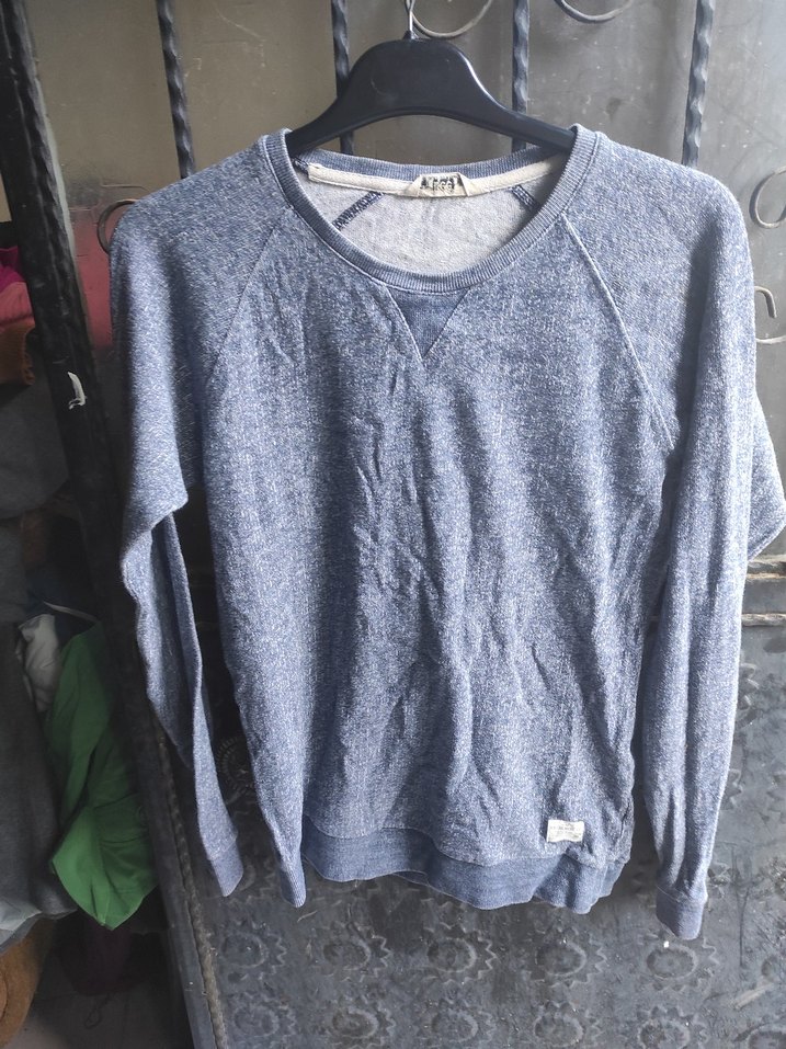 Gri renkli, yuvarlak yaka ve uzun kollu erkek sweatshirtü, rahat kesimli ve örme denim kumaştan üretilmiştir. Günlük sokak stili için uygundur.
