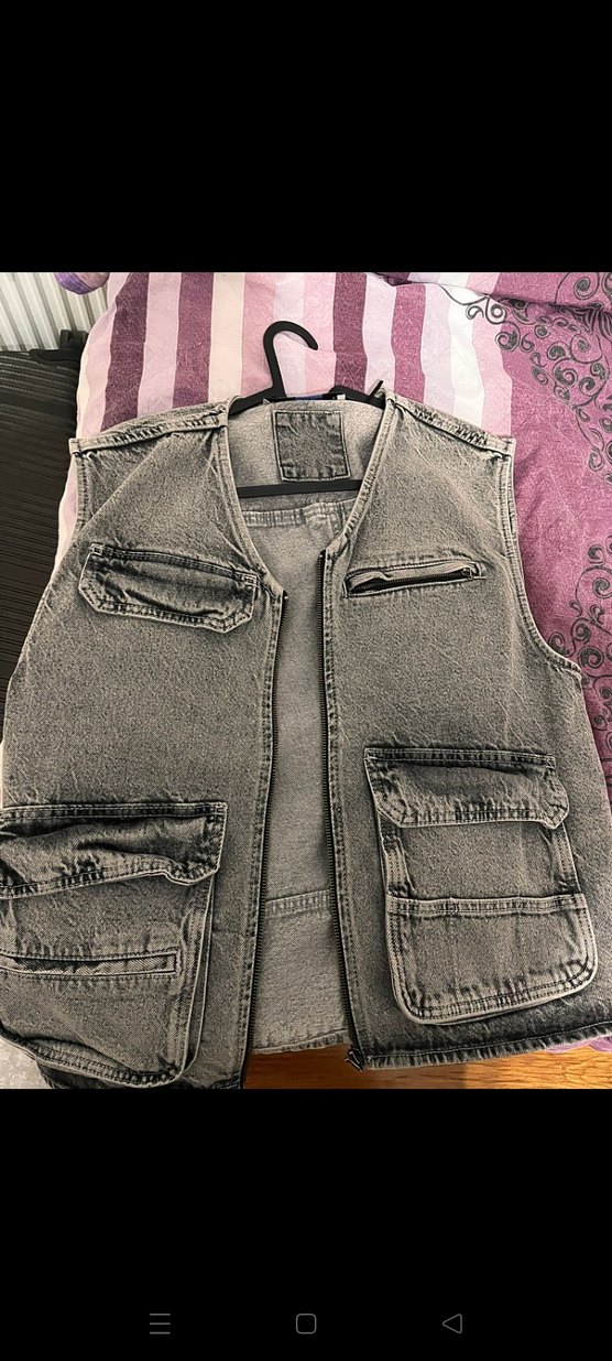 Gri renkli, düğmeli, V yaka, bol kesim ve çok cepli erkek denim yelek. Sokak stiline uygun rahat bir parça. s beden bikere giyildi