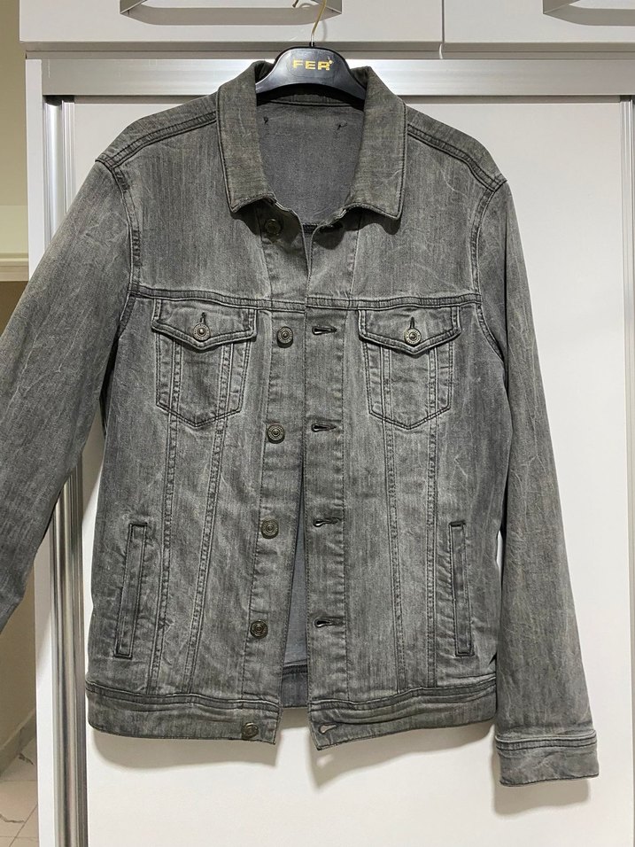 Gri renkte, düğmeli erkek denim ceketi, normal kesim, uzun kollu ve yakası notched lapel. Günlük kullanıma uygun, rahat sokak stili.